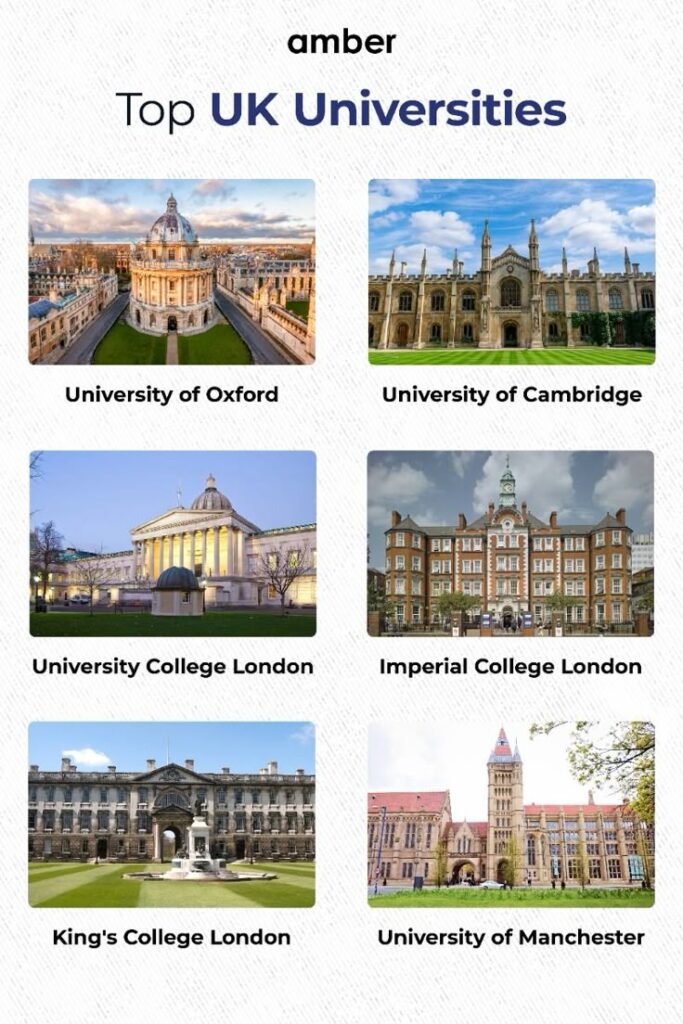 برطانیہ کی جامعات صدیوں سے تعلیم و تحقیق کا مرکز رہی ہیں۔ آکسفورڈ، کیمبرج، یونیورسٹی کالج لندن (UCL)، اور ایمپیریل کالج لندن جیسے ادارے دنیا کی ٹاپ یونیورسٹیوں میں شمار ہوتے ہیں۔